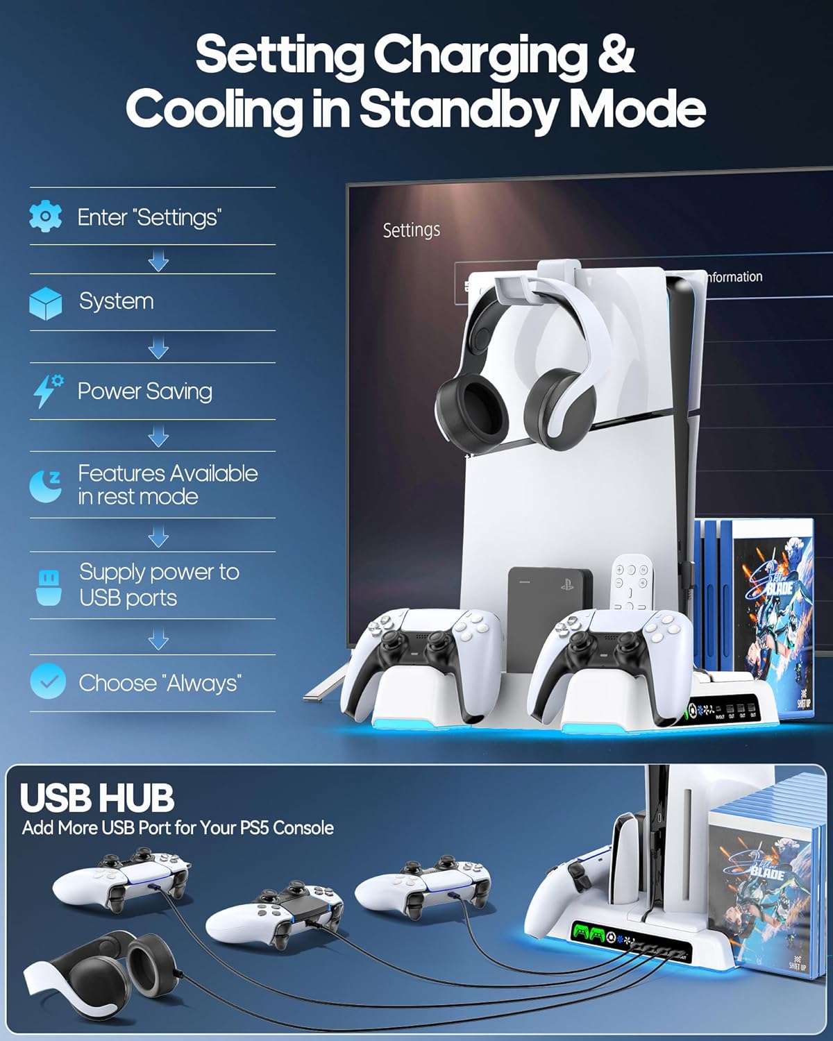 Organizador Multi-En-Uno de Accesorios PS5: El soporte para PlayStation 5 está equipado con un ventilador de refrigeración de alta eficiencia, se adapta a las consolas PlayStation 5 Digital/Disc, estaciones de carga duales para controladores ps5, soporte para auriculares, ranura para control remoto multimedia ps5, ranura para disco duro ps5 y almacenamiento para 14 tarjetas de juego ps5. Ayuda a ahorrar espacio, manteniendo tus juegos favoritos al alcance de tu mano y tu área de juego ordenada. Es una gran opción para jugadores de PS5 que necesitan un organizador ordenado para toneladas de accesorios de juego.