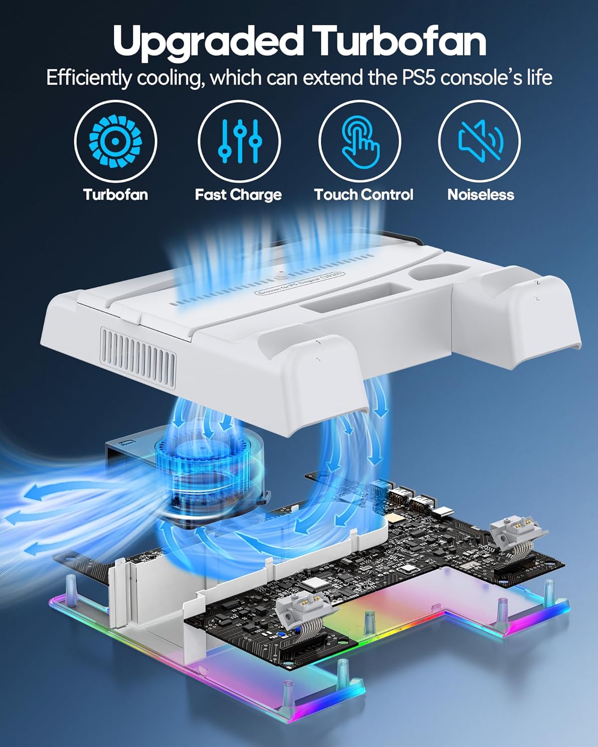 Soporte PS5 con Ventilador de Refrigeración Mejorado: Versión mejorada con turbo más grande, al aumentar el diámetro del ventilador turbo para proporcionar un flujo de aire más fuerte, mejorando enormemente la eficiencia de enfriamiento para la consola; la estación de refrigeración PS5 tiene 3 niveles de ventilador (Bajo, Medio, Alto), puedes cambiar las velocidades del ventilador mediante el interruptor táctil de encendido/apagado; el soporte de refrigeración PS5 proporciona 3 puertos de carga para la consola, que se pueden usar para cargar el controlador PS5, los auriculares PS5 y otros dispositivos simultáneamente.