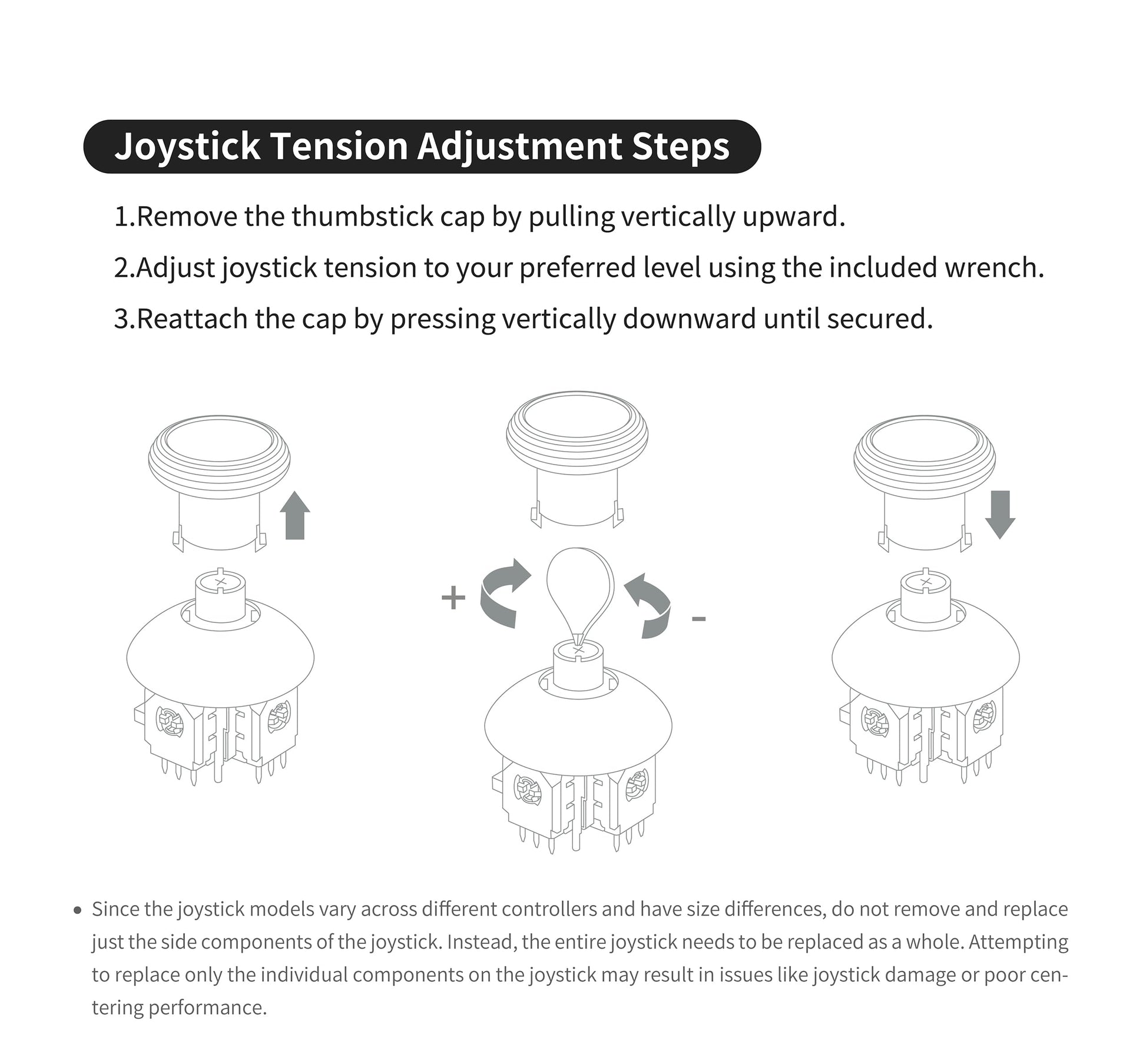 - 3 PAIRS OF JOYSTICK CAPS INCLUDED: Our joysticks kit provides 3 types of caps with different heights and feels for user. For both disassembly and assembly, you need to pull out or press down vertically along the groove. The metal ring on the joystick cap can be removed for a wider range of movement, which offers greater flexibility but may also increase wear and tear on the stick.